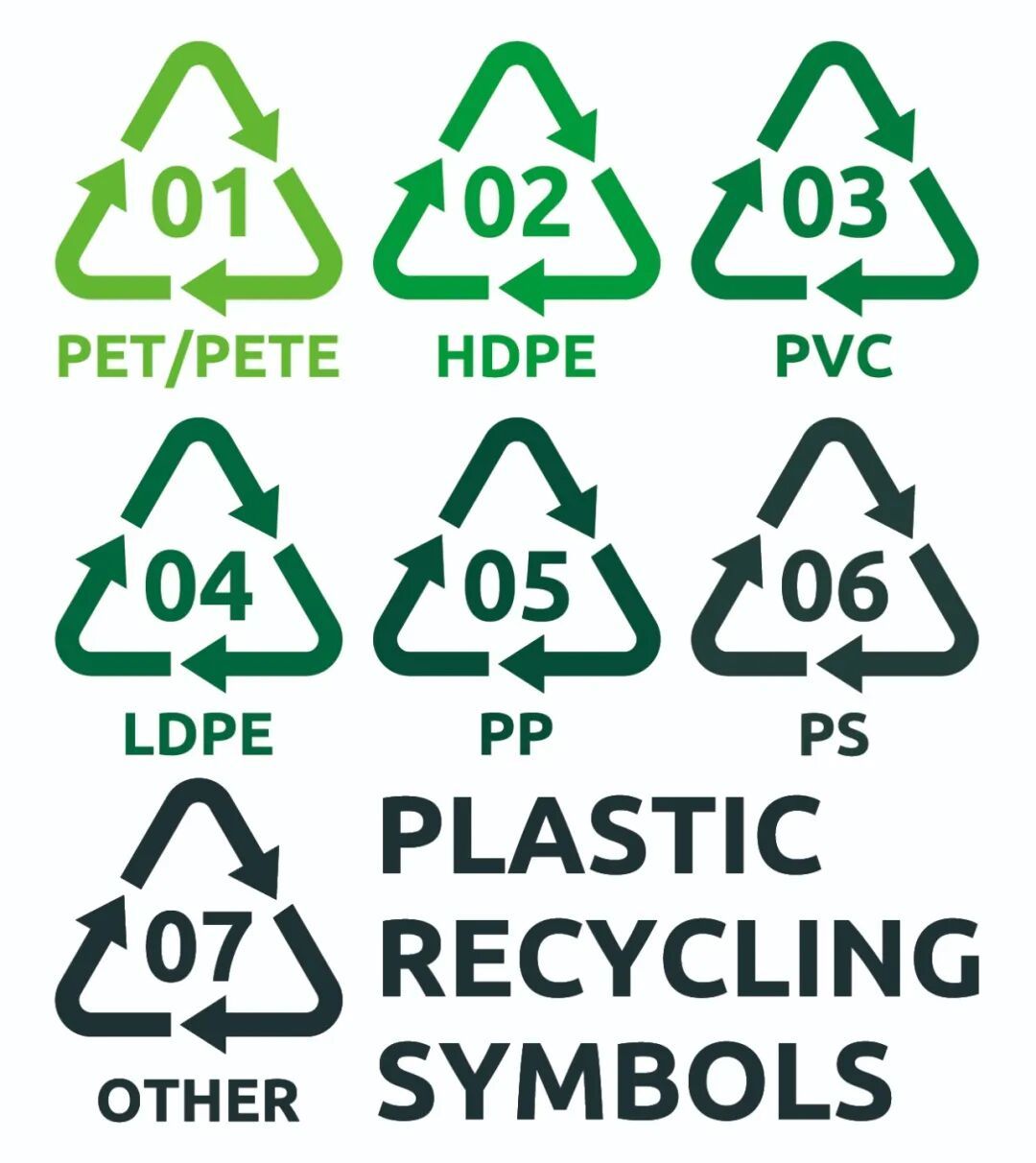 在塑料制品上,我们一般都能找到一个三角箭头的标志,标志中的序号从1—7不等,代表的是它们原料树脂的规格。不一样的等级的塑料制品,有不一样的特性和应用场景。