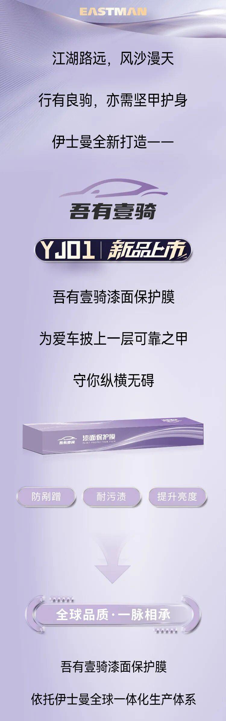 依托《财富》美国500强企业伊士曼集团百年技能沉淀与全球顶尖制作实力,旗下正品漆面保护膜吾有壹骑YJ01,以合规质量与改进服务为车主原厂车漆保驾护航,显示正规大牌的牢靠保证。